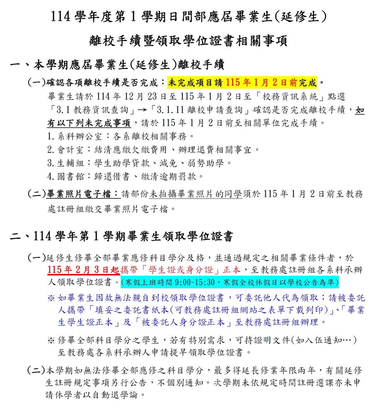 【註冊組】114學年度第1學期日間部應屆畢業生(延修生) 離校手續暨領取學位證書相關事項