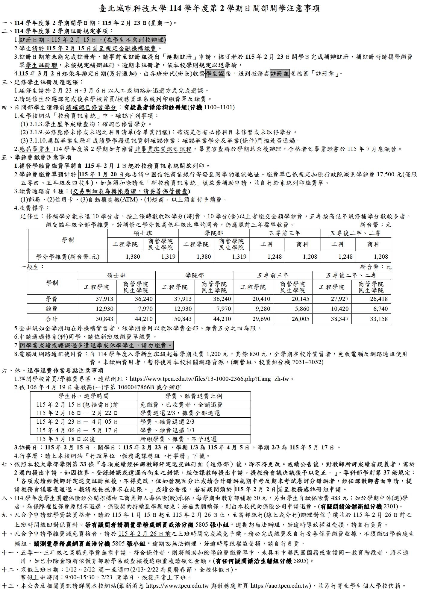 【註冊組】114學年度第2學期日間部開學注意事項