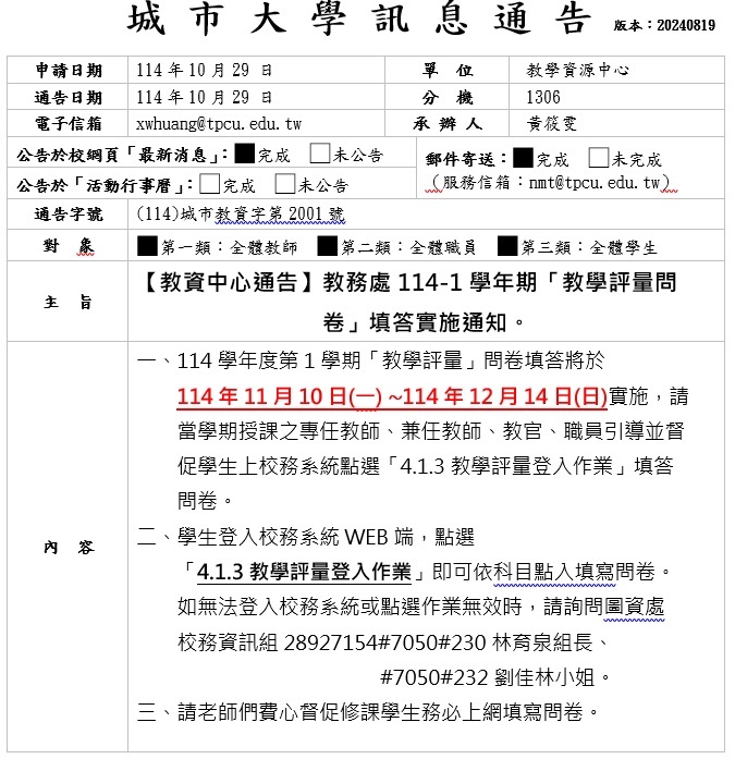 【教資中心 公告】114學年度第1學期「教學評量」填寫時間。